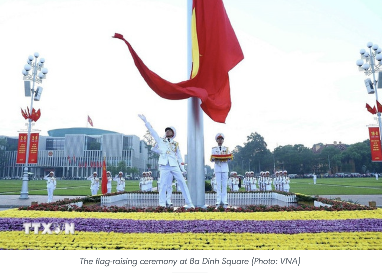 ฝูงชนรวมตัวกันหน้าสุสานของประธานาธิบดีโฮจิมินห์ที่จัตุรัสบาดินห์ในฮานอยในเช้าวันที่ 19 สิงหาคม เพื่อเป็นสักขีพยานในพิธีชูธงชาติที่ทําเครื่องหมาย 80 ปีนับตั้งแต่ชัยชนะของการปฏิวัติเดือนสิงหาคมในปี 1945