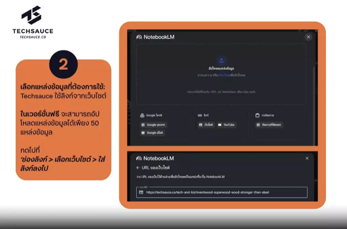 (1)NotebookLM สามารถอัปโหลดแหล่งที่มาหลากหลายประเภท
