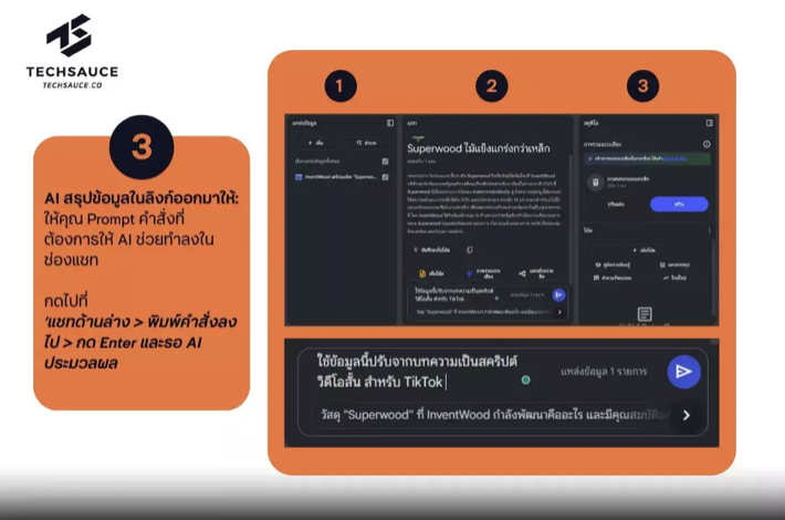 พิมพ์คำสั่งให้ AI ช่วยสรุปหรือปรับข้อมูลหลังจากระบบประมวลผลข้อมูลเสร็จ จะมีหน้าต่างแชตให้คุณโต้ตอบได้