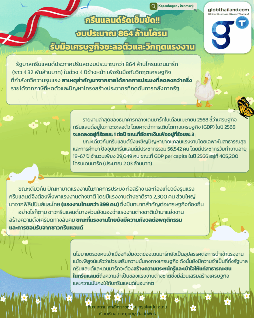 รัฐบาลกรีนแลนด์ประกาศแผนปรับลดงบประมาณรวม 864 ล้านโครนเดนมาร์ก (ประมาณ 4.32 พันล้านบาท) ในระยะเวลา 4 ปีข้างหน้า เพื่อรับมือกับความเสี่ยงทางเศรษฐกิจที่กำลังทวีความรุนแรง สาเหตุหลักมาจากกำไรภาคประมงที่ลดลงครึ่งหนึ่ง รายได้จากการจัดเก็บภาษีที่ชะลอตัว และแรงกดดันด้านโครงสร้างประชากรที่สร้างภาระต่อการคลังของรัฐ