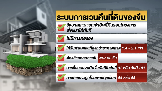 ระบบการเวนคืนที่ดินของจีน เป็นอีกหนึ่งปัจจัยสำคัญที่ช่วยเร่งโครงการพัฒนาโครงสร้างพื้นฐาน เมื่อทางการตัดสินใจสร้างโครงการใด รัฐบาลสามารถเข้ายึดที่ดินโดยรอบได้ทันที โดยไม่มีการต่อรอง ยกเว้นในพื้นที่ที่เกี่ยวข้องกับสิ่งแวดล้อม ประชาชนที่ได้รับผลกระทบจะได้รับค่าชดเชยที่สูงกว่าราคาตลาด 1.4 - 3.1 เท่า และต้องย้ายออกภายใน 90-180 วัน