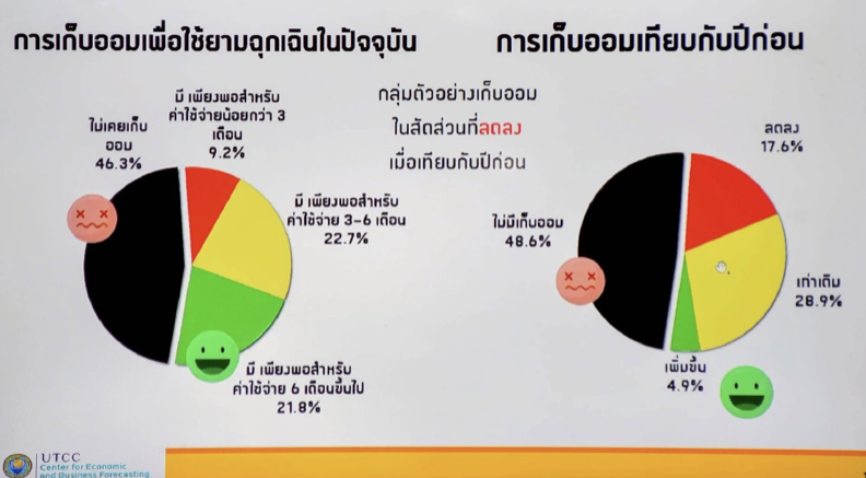 ทั้งนี้ เมื่อเปรียบเทียบสถานะทางการเงินของครัวเรือนปีนี้กับปีก่อน ส่วนใหญ่ 44.5% มีสถานะเหมือนเดิม, 28.4% แย่ลง, 20.7% แย่ลงมาก, 5.2% ดีขึ้น และ 1.2% ดีขึ้นมาก ด้านสถานะรายได้เทียบกับรายจ่าย 47.3% ตอบว่ามีเงินเหลือเก็บ และ 22.2% เงินไม่เพียงพอใช้จ่าย