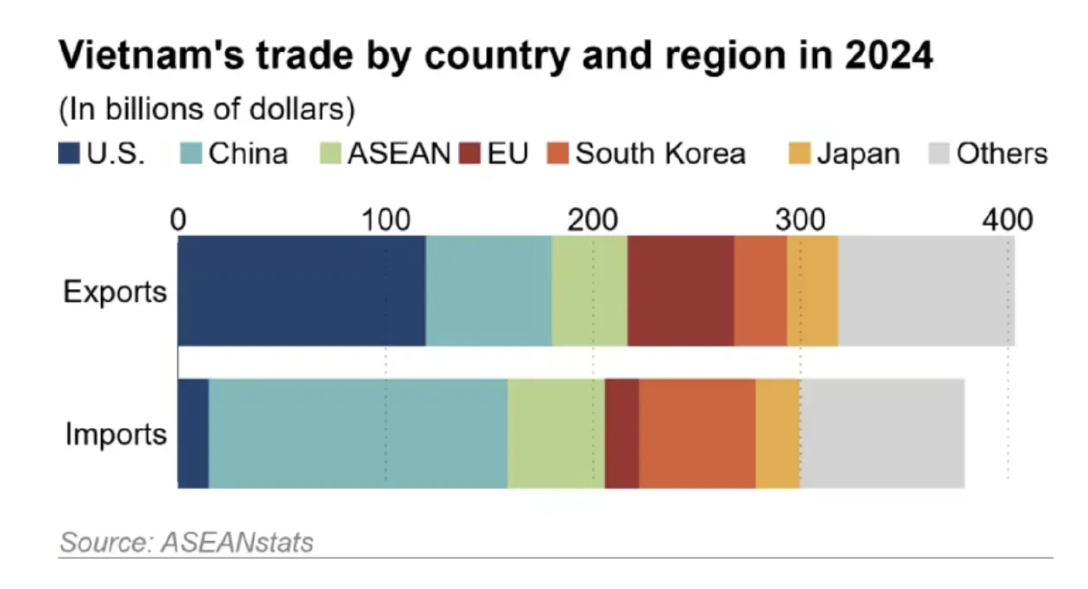 ในปัจจุบัน เวียดนามเป็นศูนย์กลางการผลิตสำหรับบริษัทต่างชาติที่กำลังเติบโต ตั้งแต่สินค้าในกลุ่มเทคโนโลยีอย่าง Apple ไปจนถึงแบรนด์เสื้อผ้ากีฬายอดนิยม Lululemon อย่างไรก็ตาม การที่ประธานาธิบดีทรัมป์ กำหนดเกณฑ์ภาษีเกี่ยวกับสินค้าสวมสิทธิ์จากจีนไว้ที่ 40% รวมถึงภาษีนำเข้าสินค้าอื่น ๆ ที่ 20% ส่งผลให้ผู้ผลิตส่วนใหญ่ในประเทศ ที่นำเข้าวัตถุดิบมาจากจีนต้องประสบปัญหา