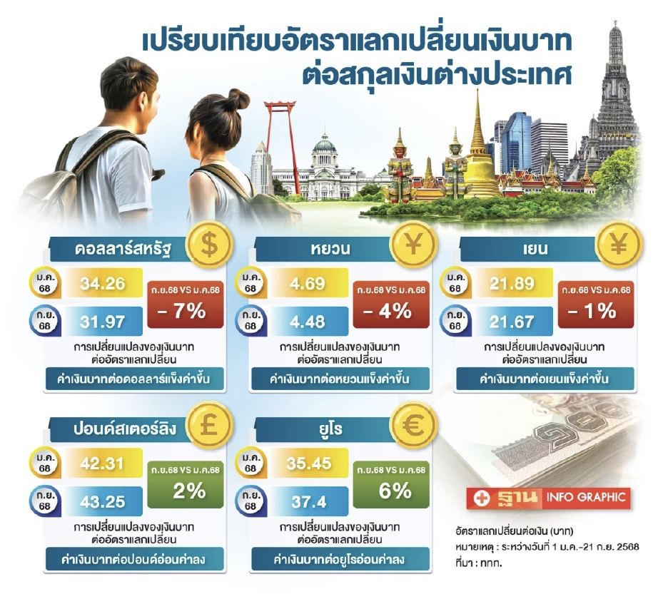 ด้านค่าเงินบาทต่อปอนด์อ่อนค่าลง 2% โดยอัตราแลกเปลี่ยนเปลี่ยนแปลงจาก 42.31 บาทต่อปอนด์ในเดือนม.ค.68 มาอยู่ที่ 43.25 บาทต่อปอนด์ในเดือนก.ย.68 ด้านค่าเงินบาทต่อยูโรอ่อนค่าลง 6 % โดยอัตราแลกเปลี่ยนเปลี่ยนแปลงจาก 35.45 บาทต่อยูโรในเดือนม.ค.68 มาอยู่ที่ 37.48 บาทต่อปอนด์ในเดือนก.ย.68