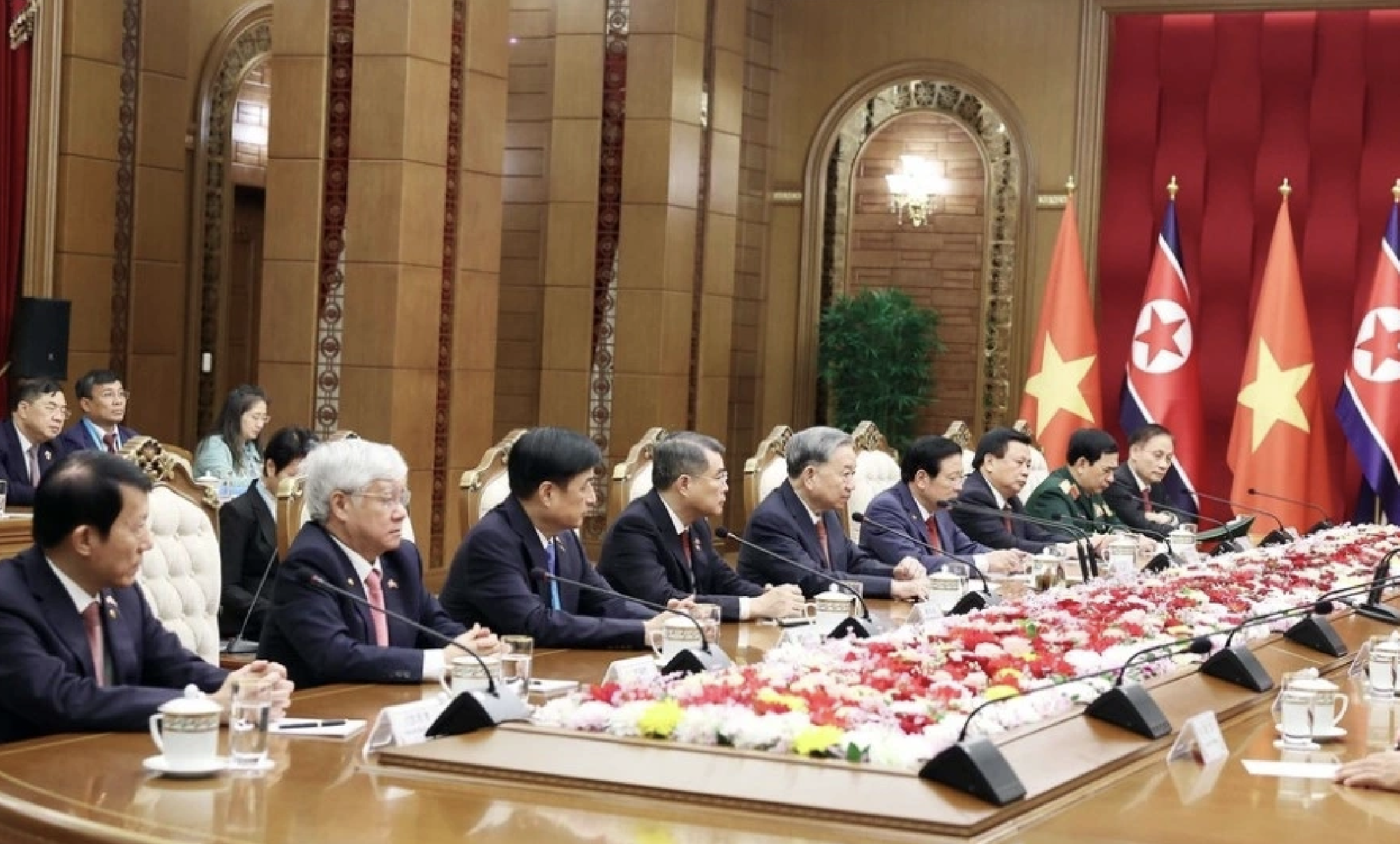 เลขาธิการพรรคคอมมิวนิสต์เวียดนาม (CPV) To Lam เจรจากับเลขาธิการพรรคแรงงานเกาหลี (WPK) และประธานกิจการรัฐของสาธารณรัฐประชาธิปไตยประชาชนเกาหลี (DPRK) Kim Jong Un ที่สํานักงานใหญ่ WPK เมื่อวันที่ 9 ตุลาคมในเปียงยาง ทันทีหลังจากพิธีต้อนรับอย่างเคร่งขรึมสําหรับผู้นําพรรคเวียดนาม