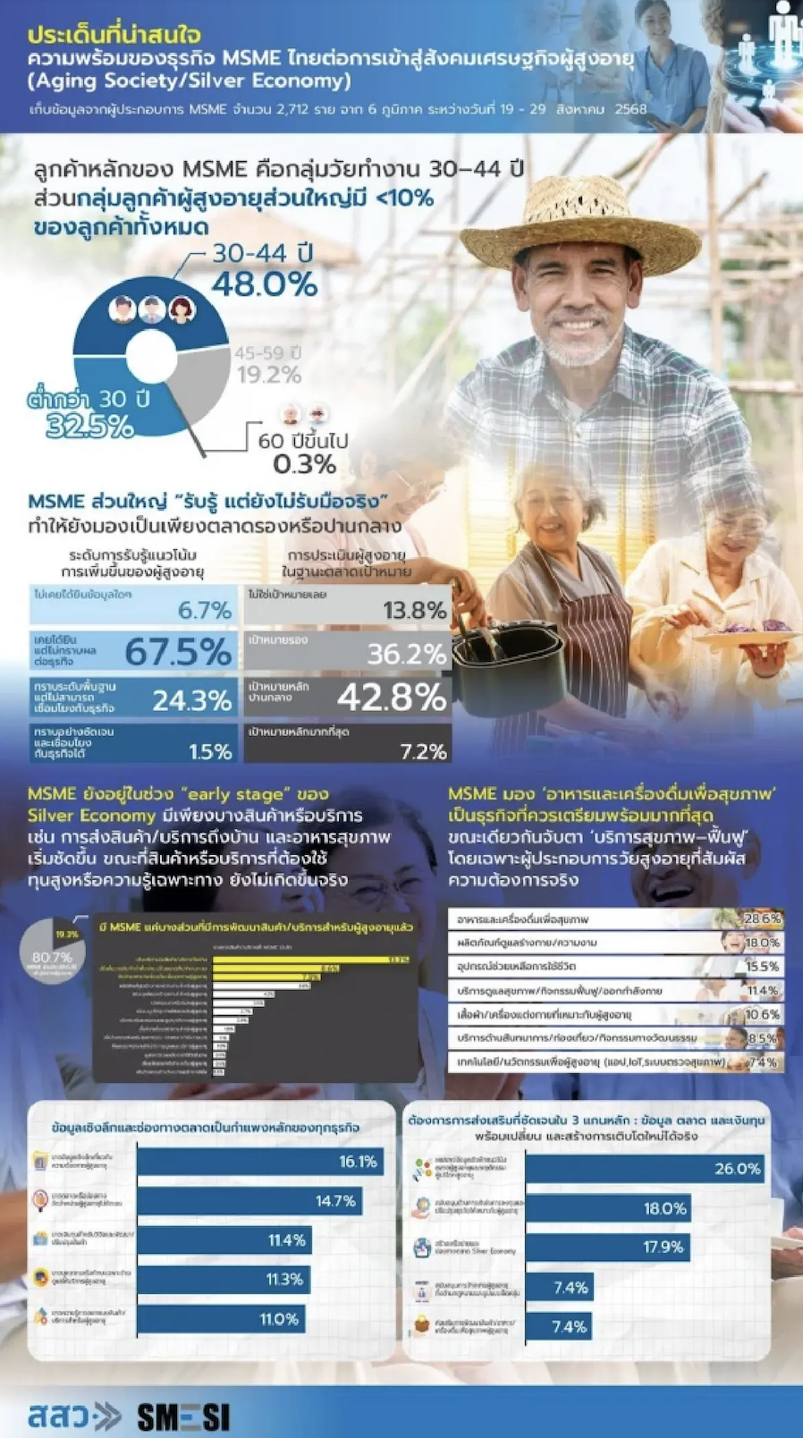 นางสาวปณิตา ชินวัตร รองผู้อำนวยการรักษาการแทนผู้อำนวยการสำนักงานส่งเสริมวิสาหกิจขนาดกลางและขนาดย่อม (สสว.) เปิดเผยผลสำรวจความคิดเห็นผู้ประกอบการ SME เกี่ยวกับความพร้อมของธุรกิจต่อการเข้าสู่สังคมผู้สูงอายุ (Aging Society/Silver Economy) โดยเก็บข้อมูลจากผู้ประกอบการ SME จำนวน 2,712 ราย จาก 6 ภูมิภาค ระหว่างวันที่ 19–29 สิงหาคม 2568 พบว่า ปัจจุบัน SME เริ่มมีการจ้างงานผู้สูงอายุเฉลี่ยอยู่ที่ร้อยละ 11 โดยเฉพาะภาคธุรกิจการเกษตรมีสัดส่วนการจ้างงานสูงสุดอยู่ที่ร้อยละ 17 และธุรกิจขนาดกลางมีแนวโน้มจ้างงานผู้สูงอายุมากกว่าธุรกิจรายย่อย (Micro)