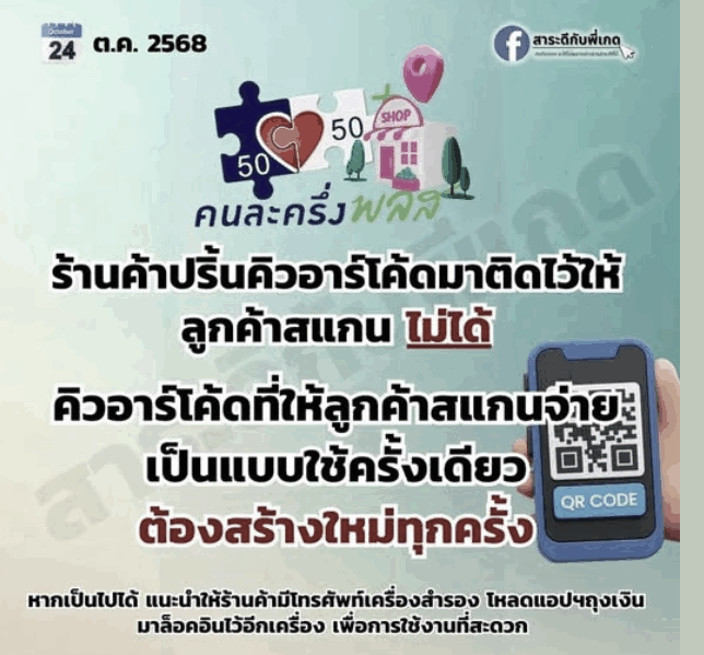 ข้อควรรู้! ห้ามร้านค้า ติดคิวอาร์โค้ดหน้าร้าน รับเงินคนละครึ่งพลัส ต้องสร้างคิวอาร์ใหม่ทุกครั้ง