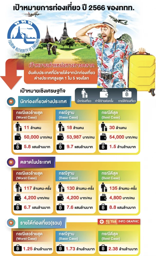 นายยุทธศักดิ์ สุภสร ผู้ว่าการการท่องเที่ยวแห่งประเทศไทย(ททท.) เปิดเผยกับ “ฐานเศรษฐกิจ”ว่าบอร์ดททท.มีมติเห็นชอบเป้าหมายการดำเนินงานของททท.ปี2566 ได้แก่ “เป้าหมายตำแหน่งทางการตลาด” คือ การผลักดันอันดับประเทศที่มีรายได้จากนักท่องเที่ยวต่างประเทศสูงสุด 1 ใน 5 ของโลก “เป้าหมายเชิงเศรษฐกิจ” แบ่งเป็น 3 ซีเนริโอ คือ Worst Case , Base Case และ Best Case ททท.ตั้งเป้าหมายรายได้รวม(ตลาดในประเทศและตลาดต่างประเทศ) อยู่ที่ 1.25-2.38 ล้านล้านบาท