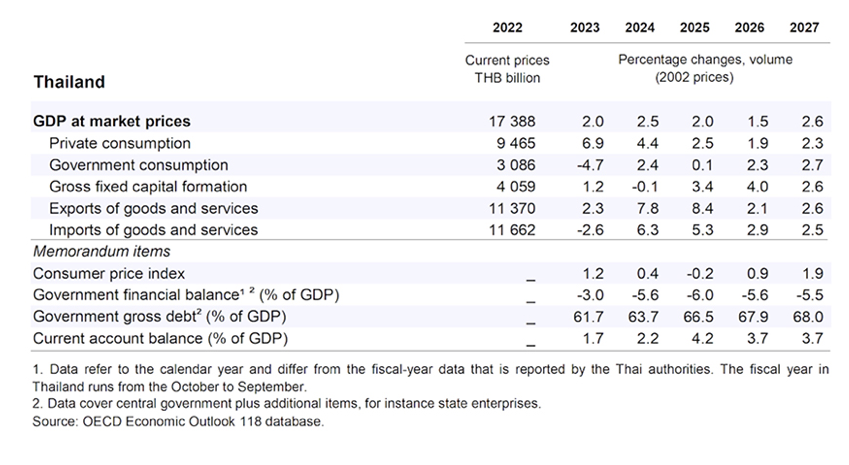 OECD คาด GDP ประเทศไทยปี 2026 เติบโต 1.5% ชะลอลงจากปีนี้ที่คาดว่าจะเติบโต 2% จากผลกระทบเชิงลบของนโยบายการค้าระหว่างประเทศ ส่วนปี 2027 มีโอกาสกลับมาเติบโต 2.6% ด้านสถาบันป๋วยชี้ปัญหาหลักเศรษฐกิจไทยคือ ผลิตภาพ (Productivity) เติบโตต่ำเพียง 0.5% โดยเฉลี่ย