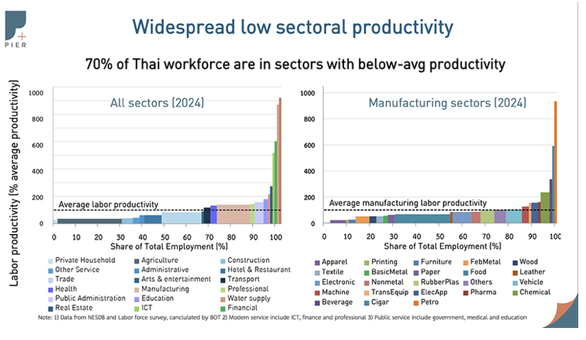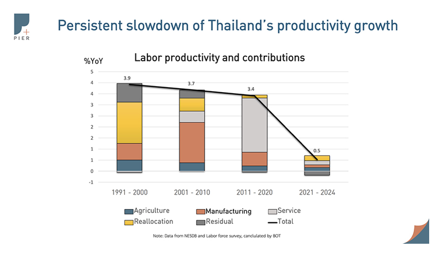 “ในอดีตไทยได้ประโยชน์จากการย้ายแรงงานจากเกษตรไปสู่ภาคการผลิต แต่ปัจจุบันภาคบริการมีบทบาทมากขึ้นแต่กลับมีผลิตภาพต่ำ ทำให้ภาพรวมชะลอตัว ผลิตภาพต่ำกระจายตัวไปทั่ว โดยเฉพาะกลุ่มที่ใช้แรงงานเข้มข้น (Labor intensive)”
