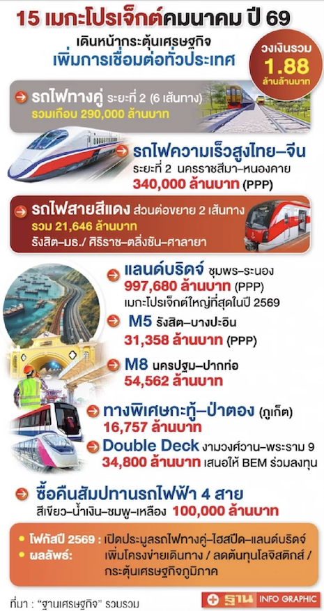 * โครงการสำคัญที่คาดว่าจะเริ่มเปิดประมูลหรือลงนามสัญญาในปี 2569 ได้แก่ โครงการแลนด์บริดจ์, รถไฟความเร็วสูงไทย-จีน ระยะที่ 2 และรถไฟทางคู่ ระยะที่ 2