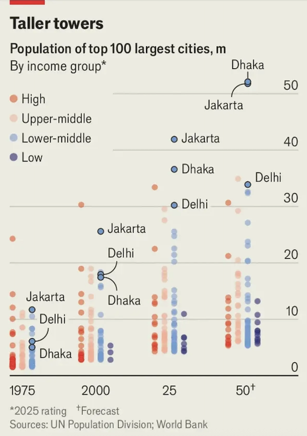 สิ่งที่น่าสังเกตคือ การเติบโตเกิดขึ้นส่วนใหญ่ในเอเชียที่มีรายได้ปานกลาง ในเมืองใหญ่ที่สุดของโลก 10 เมือง มีแค่แห่งเดียวที่ไม่ได้อยู่ในเอเชีย และจากเมืองใหญ่ 33 เมืองทั่วโลก (ประชากรเกิน 10 ล้าน) มีแค่ 7 เมืองเท่านั้นที่อยู่ในประเทศรวย และคาดว่าภายในปี 2050 จาการ์ตากับธากาจะมีประชากรเพิ่มขึ้นรวมกันอีก 25 ล้านคน เท่ากับประชากรทั้งประเทศออสเตรเลีย