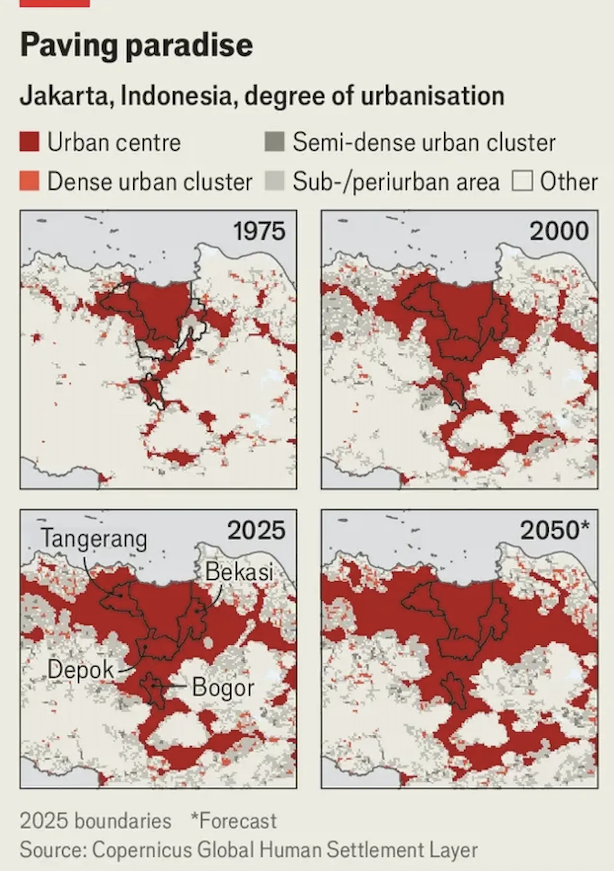 จาการ์ตาเป็นตัวอย่างที่ชัดเจนของปัญหา เมื่อเมืองขยายตัว จาการ์ตาได้รวมเอาเมืองใกล้เคียงอย่าง โบกอร์ เดปอก ทันเจอรัง และเบกาสี เข้ามาด้วย แต่หน่วยงานต่างๆ แทบไม่คุยกัน ทำให้เมืองที่มีคนเท่ากับบางประเทศถูกบริหารแบบไร้แผน