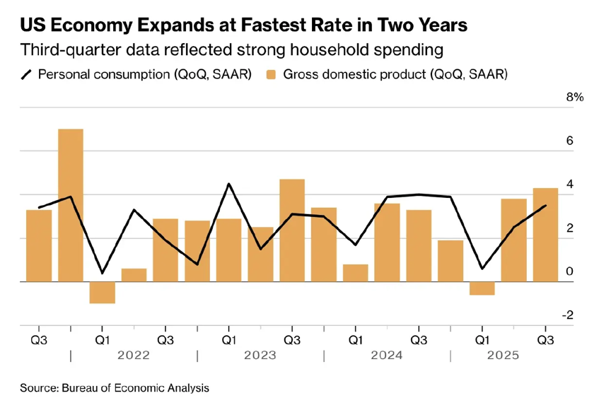 เศรษฐกิจสหรัฐฯ ขยายตัวในไตรมาสที่สามด้วยอัตราสูงสุดในรอบสองปี ได้รับแรงหนุนจากการใช้จ่ายของผู้บริโภคและภาคธุรกิจที่แข็งแกร่ง และนโยบายการค้าที่ผ่อนคลายมากขึ้น