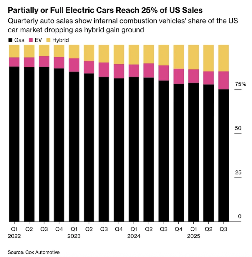 ในปัจจุบัน รถยนต์ใหม่ที่ขายได้ทั่วโลกทุกๆ 4 คัน จะเป็นรถ EV อย่างน้อย 1 คัน ผลจากการที่จีนเร่งเปลี่ยนผ่านอย่างรวดเร็วและส่งออกรถไฟฟ้าไปทั่วโลกมากขึ้นเรื่อยๆ ทำให้ตลาดรถน้ำมันเบนซินและดีเซลทั่วโลกกำลังหดตัวลงอย่างต่อเนื่อง ในขณะที่ตลาดแบตเตอรี่คือพื้นที่เดียวที่ยังมีการขยายตัว