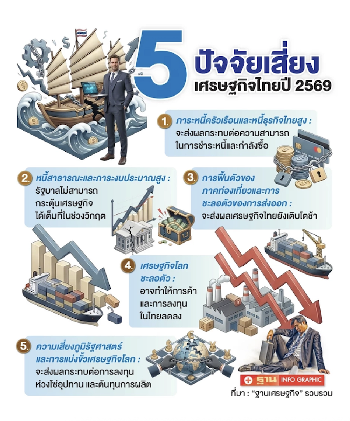เศรษฐกิจไทยปี 2569 ยังอยู่บนความท้าทายรอบด้าน ท่ามกลางความผันผวนของเศรษฐกิจโลก ภาคเอกชนยังคาดหวังว่าเศรษฐกิจไทยจะไม่แย่ไปกว่าปีที่ผ่านมาโดยการส่งออก การท่องเที่ยว และการลงทุนจากต่างประเทศ ยังเป็นแรงขับเคลื่อนสำคัญ