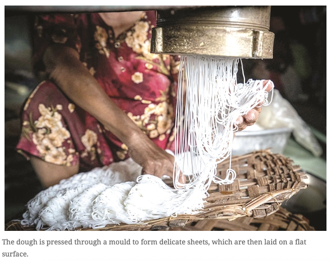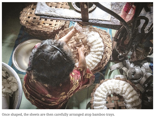 แป้งถูกกดผ่านแม่พิมพ์เพื่อสร้างแผ่นที่ละเอียดอ่อนซึ่งวางบนพื้นผิวเรียบ เมื่อมีรูปร่างแล้ว แผ่นจะถูกนึ่งอีกครั้งเพื่อรักษาเนื้อสัมผัสที่นุ่ม จากนั้นพวกเขาจะถูกจัดเรียงอย่างระมัดระวังบนใบตองที่วางอยู่บนถาดไม้ไผ่