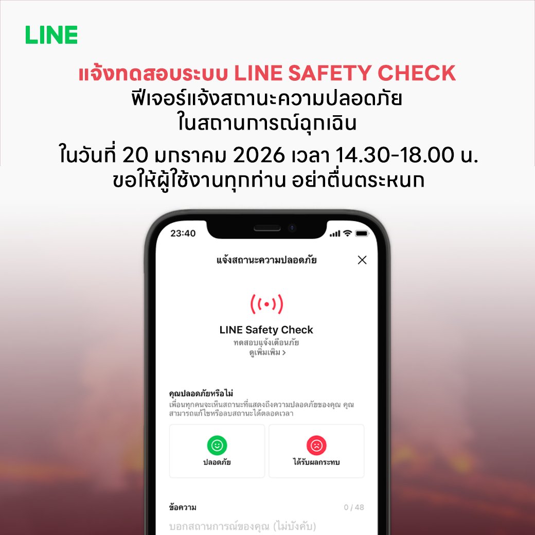 โดยจะทดสอบในวันนี้ (20 มกราคม 2569) ช่วงเวลา 14:30 น. – 18:00 น. ผู้ใช้งานอาจเห็นการแจ้งเตือน LINE Safety Check ในหน้าแอปพลิเคชัน LINE