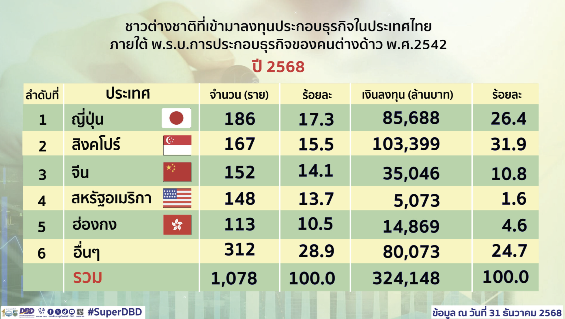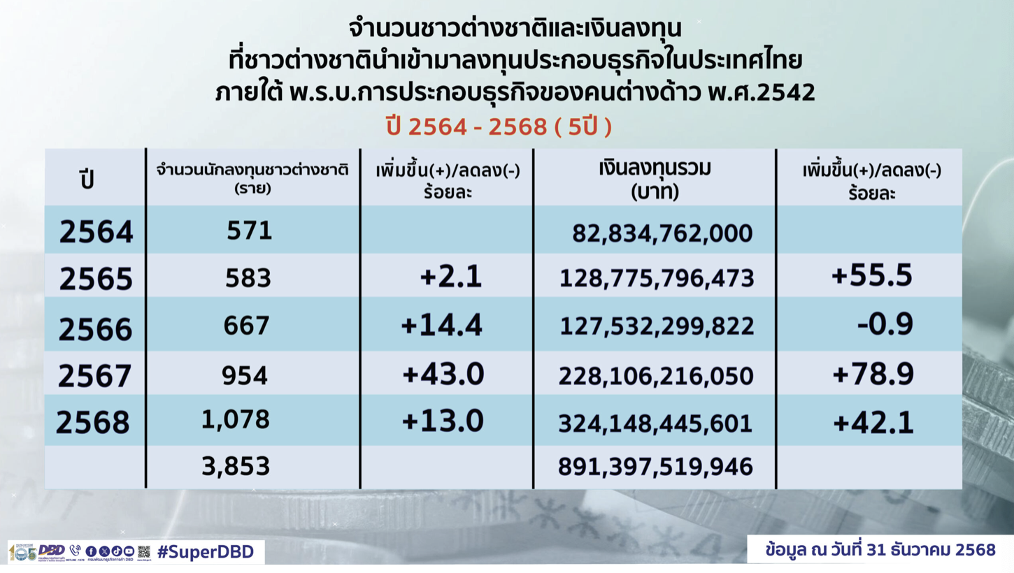 เฉพาะเดือนธันวาคม 2568 มีการอนุญาตให้คนต่างชาติเข้ามาประกอบธุรกิจในประเทศไทย 105 ราย เป็นการลงทุนผ่านช่องทางการขอรับใบอนุญาตประกอบธุรกิจของคนต่างด้าว 28 ราย และการขอหนังสือรับรองการประกอบธุรกิจของคนต่างด้าว (ผ่านช่องทางการลงทุนตามกฎหมายว่าด้วยการส่งเสริมการลงทุน หรือได้รับอนุญาตตามกฎหมายว่าด้วยการนิคมอุตสาหกรรมแห่งประเทศไทย และการใช้สิทธิตามสนธิสัญญาหรือความตกลงระหว่างประเทศ) 77 ราย เงินลงทุนรวมทั้งสิ้น 12,986 ล้านบาท