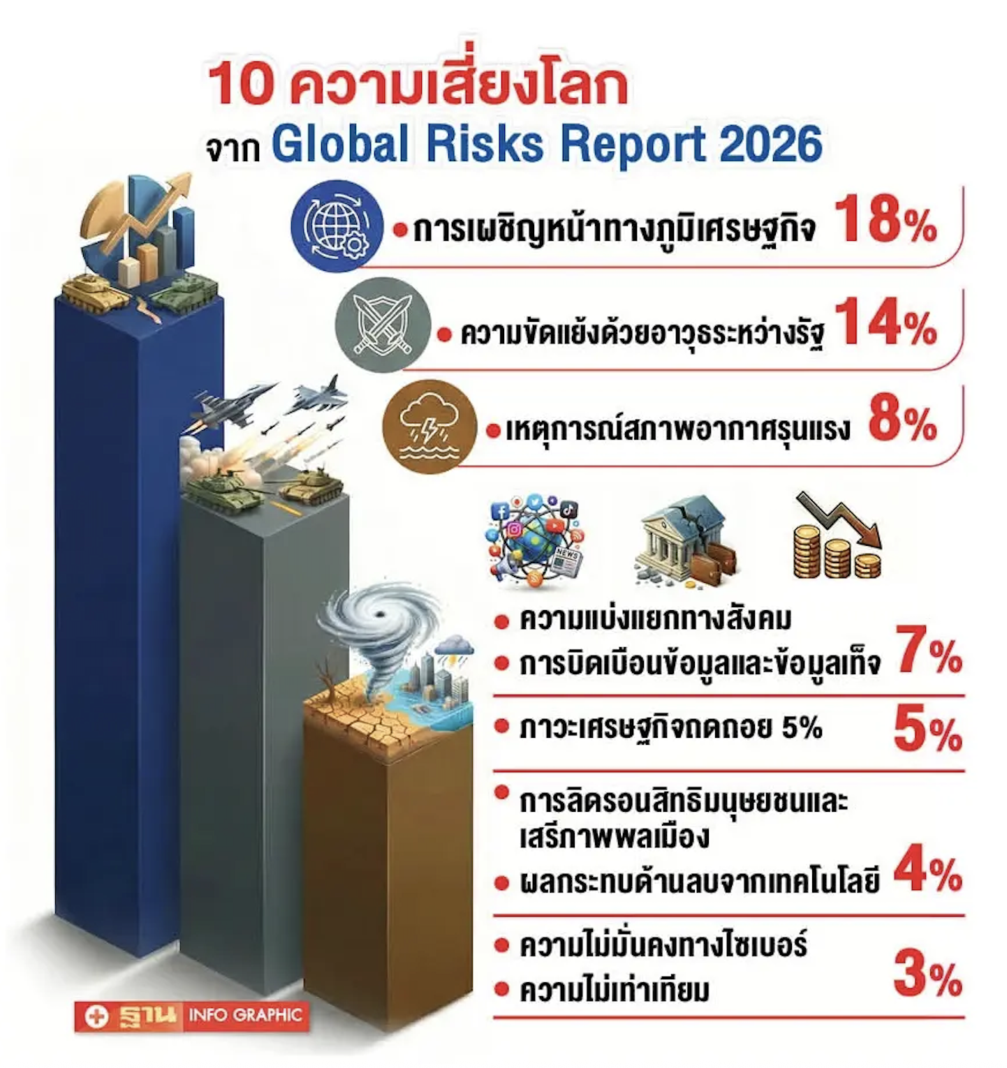 รายงาน Global Risks Report 2026 เผยอันดับความเสี่ยงที่น่ากังวลที่สุดในปีนี้ คือการเผชิญหน้าทาง ภูมิเศรษฐกิจ (18%) ที่กระโดดขึ้นมาเป็นอันดับหนึ่ง จากการใช้เครื่องมือทางเศรษฐกิจและการค้าเป็นอาวุธเพื่อชิงความได้เปรียบระหว่างประเทศ ตามมาด้วย ความขัดแย้งด้วยอาวุธระหว่างรัฐ (14%) แม้จะตกจากอันดับหนึ่งของปีที่แล้ว แต่ภัยจากสงครามและความตึงเครียดทางทหารยังคงรุนแรง ขณะที่เหตุการณ์สภาพอากาศรุนแรง (8%) ตกลงมาหนึ่งอันดับอยู่ที่อันดับ 3 แต่ยังคงเป็นความกังวลหลักด้านสิ่งแวดล้อมที่ส่งผลกระทบวงกว้าง