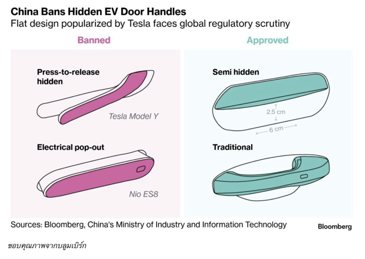 จากกรณีกระทรวงอุตสาหกรรมและเทคโนโลยีสารสนเทศจีน (MIIT) ออกประกาศเมื่อวันที่ 2 กุมภาพันธ์ แบน ‘มือจับประตูแบบซ่อน’ (Hidden Door Handles หรือ Concealed Door Handles) ในรถยนต์ไฟฟ้า (อีวี) ซึ่งจะมีผลบังคับใช้วันที่ 1 มกราคม 2027 ถือเป็นประเทศแรกในโลกที่ทำการแบนมือจับรูปแบบดังกล่าว ซึ่งออกแบบโดยเทสลา (Tesla) และได้รับความนิยมอย่างมาก