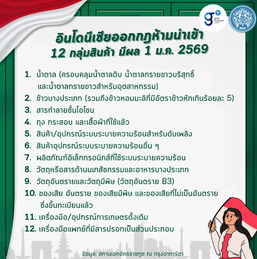 กระทรวงการค้าอินโดนีเซีย ได้ออกกฎกระทรวงเกี่ยวกับสินค้าที่ห้ามนำเข้าซึ่งมีผลบังคับใช้ตั้งแต่วันที่ 1 ม.ค. 2569 เพื่อรวบรวมและปรับปรุงบัญชีรายการสินค้าที่ถูกห้ามนำเข้าให้ทันสมัยขึ้นแทนกฎเก่าที่ไม่สอดคล้องกับสภาพความเป็นจริงทางการค้า สภาพเศรษฐกิจ และกรอบการกำกับดูแลในปัจจุบัน