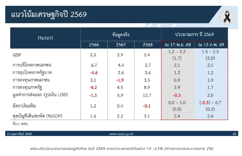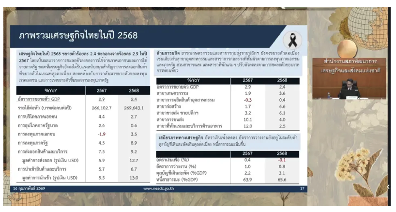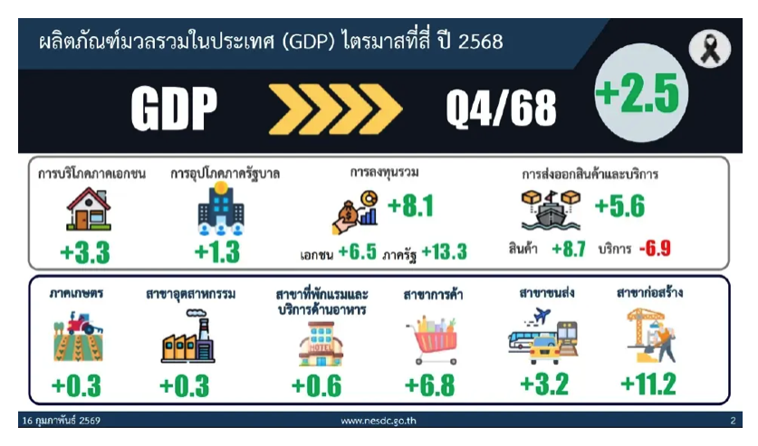 16 กุมภาพันธ์ 2569 นายดนุชา พิชยนันท์ เลขาธิการสภาพัฒนาการเศรษฐกิจและสังคมแห่งชาติ (สศช.) เปิดเผยรายงานภาวะเศรษฐกิจไทยไตรมาสที่ 4 ของปี 2568 และแนวโน้มปี 2569 ว่า เศรษฐกิจไทยไตรมาสที่ 4 ปี 2568 ผลิตภัณฑ์มวลรวมภายในประเทศ (GDP) ขยายตัว 2.5% ส่งผลให้ทั้งปี 2568 เศรษฐกิจไทยขยายตัว 2.4% เพิ่มขึ้นจากเป้าหมายเดิมที่คาดว่าจะขยายตัวเพียง 2%
