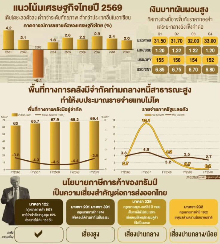 ทั้งนี้ ไทยยังเผชิญแรงปะทะจากรอบด้าน ทั้งเศรษฐกิจที่มีแนวโน้มชะลอตัว จากภาคการส่งออกที่ได้รับผลกระทบจากนโยบายกีดกันการค้าของสหรัฐ และการค้าโลกชะลอตัวลง ทำให้ปี 2569 การส่งออกจะหดตัว 0.4% จากที่เคยเติบโต 12.7% ในปี 2568