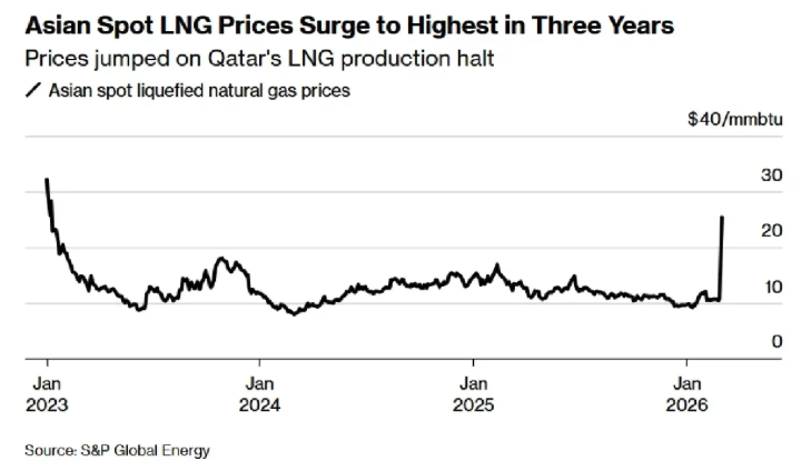บลูมเบิร์กรายงานว่า ราคาก๊าซธรรมชาติเหลว (LNG) ในเอเชีย พุ่งทะยานแตะระดับสูงสุดในรอบ 3 ปี หรือนับตั้งแต่ปี 2023 เนื่องจากความขัดแย้งในตะวันออกกลางทำให้โรงงานส่งออกที่ใหญ่ที่สุดในโลกของกาตาร์ต้องปิดตัวลง และการขนส่งผ่านช่องแคบฮอร์มุซหยุดชะงัก
