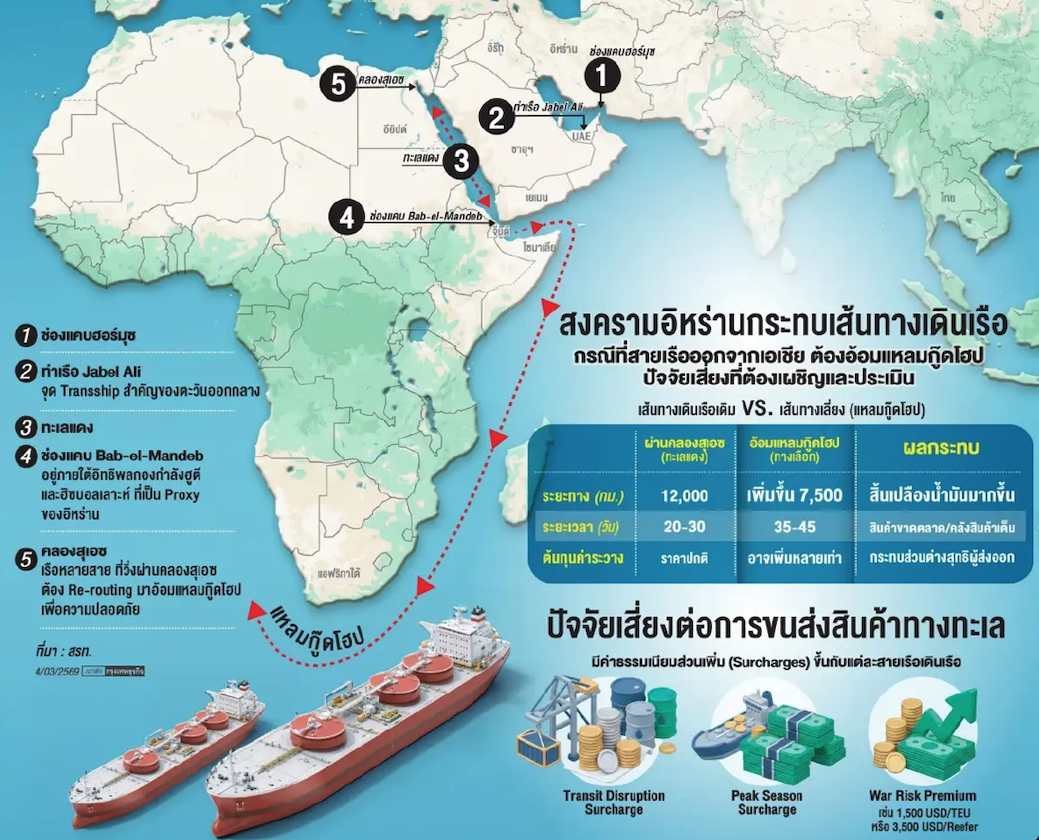การอ้อมเส้นทางนี้ทำให้ระยะเวลาขนส่งล่าช้าออกไป 2-3 สัปดาห์ และเพิ่มต้นทุนเชื้อเพลิงอย่างมีนัยสำคัญ ส่งผลกระทบเป็นวงกว้างต่อการค้าระหว่างเอเชีย ตะวันออกกลาง และยุโรปต้นทุนพุ่ง ท่าเรือแออัด และความเสี่ยงตู้เปล่าขาดแคลน