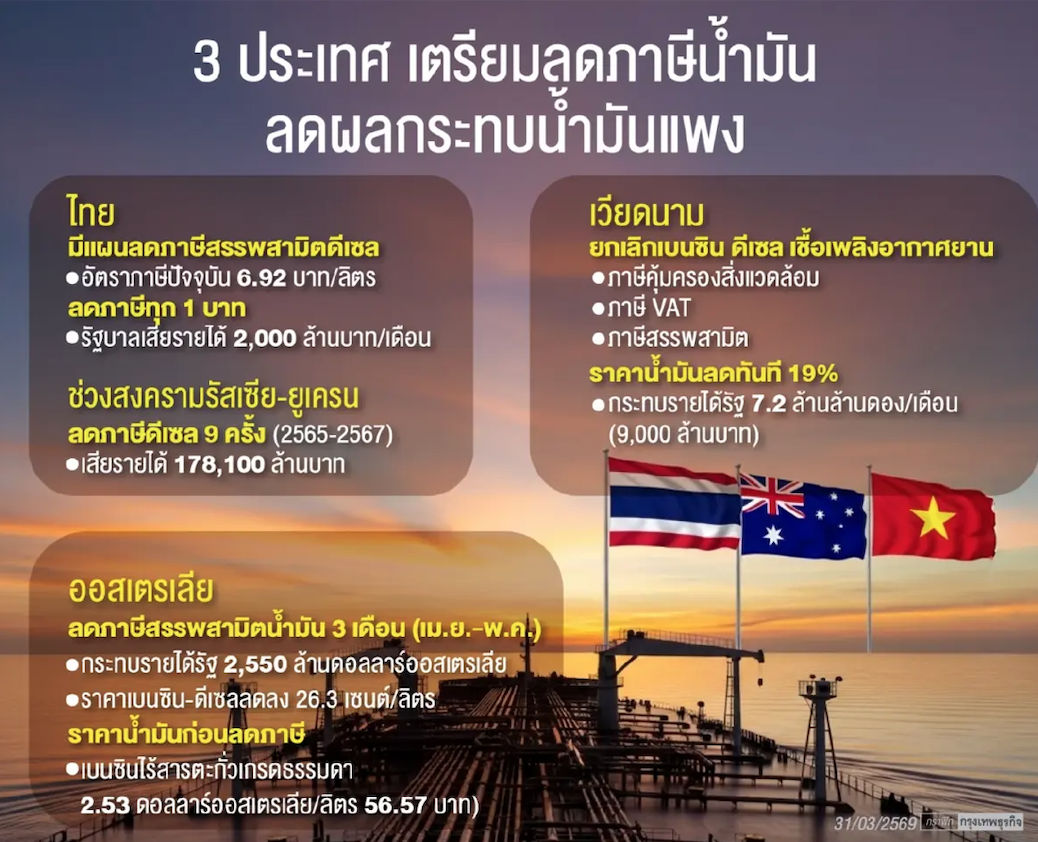 ขณะที่ไทยได้มีการพิจารณาในที่ประชุมคณะรัฐมนตรี (ครม.) นัดพิเศษวันที่ 26 มี.ค.2569 โดยเห็นชอบในหลักการให้กระทรวงการคลังพิจารณาลดภาษีสรรพสามิตน้ำมัน