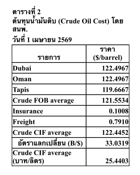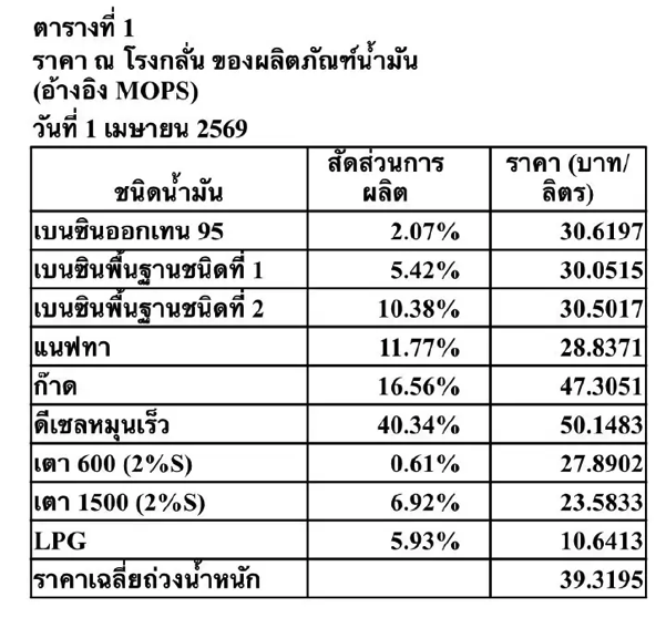 หากใช้วิธีคำนวณตามข้อมูลใน วันที่ 1 เมษายน 2569 จะเห็นภาพ “ผลประโยชน์ส่วนเกิน” ของโรงกลั่นค่อนข้างชัด ราคาเฉลี่ยถ่วงน้ำหนักที่โรงกลั่นได้รับจริงจากการขายผลิตภัณฑ์ตามตารางที่ 1 เท่ากับ 39.3195 บาทต่อลิตร ขณะที่ต้นทุนน้ำมันดิบตามตารางที่ 2 ซึ่งยังไม่รวม war premium เท่ากับ 25.4403 บาทต่อลิตร สนพ. เรียกผลต่างระหว่าง 2 ตัวเลขนี้ว่า “ค่าการกลั่น” (Gross Refining Margin) ซึ่งในกรณีนี้เท่ากับ 13.8792 บาทต่อลิตร