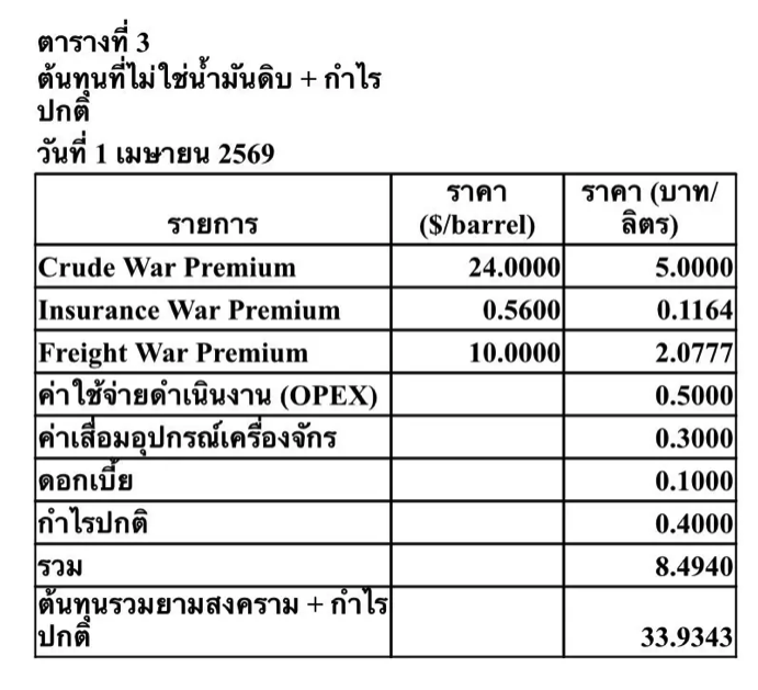 แต่เมื่อนำ war premium กับต้นทุนเพิ่มเติมอื่น ๆ ในตารางที่ 3 มารวมกัน ได้แก่war premium ของ crude 5 บาทต่อลิตร ค่าประกันภัยสงคราม 0.1164 บาท ค่าระวางสงคราม 2.0777 บาท OPEX 0.5 บาท ค่าเสื่อม 0.3 บาท ดอกเบี้ย 0.1 บาทและ “กำไรปกติ” 0.4 บาท จะได้ต้นทุนเพิ่มเติมรวม 8.4940 บาทต่อลิตร ดังนั้น“ต้นทุนรวมยามสงครามบวกกำไรปกติ” จึงเท่ากับ 33.9343 บาทต่อลิตร (25.4403 + 8.4940) และส่วนต่างระหว่างราคาที่โรงกลั่นได้รับจริงกับราคาที่โรงกลั่นควรได้รับตามปกติจึงอยู่ที่ 5.3852 บาทต่อลิตร (39.3195 – 33.9343)