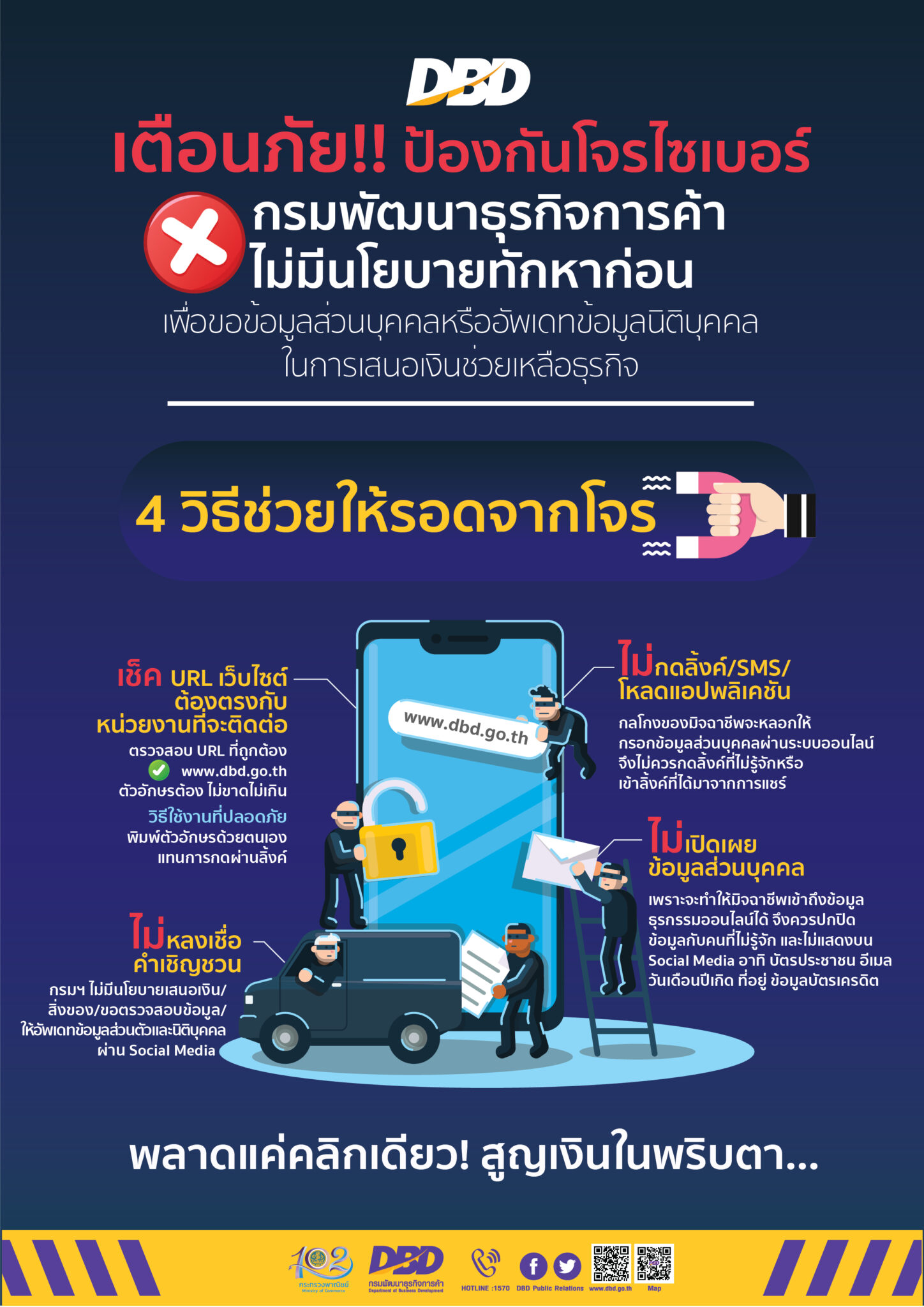 กรมพัฒนาธุรกิจการค้า ย้ำเตือนหลังได้รับแจ้งว่ามีมิจฉาชีพหลอกลวงประชาชนอย่างต่อเนื่อง พร้อมแนะนำ 4 วิธีเอาตัวรอดจากโจรไซเบอร์ ทั้งนี้ กรมอยู่ระหว่างรวบรวมพยานหลักฐานเพื่อดำเนินคดีเอาผิดกับมิจฉาชีพให้ถึงที่สุดที่แอบอ้างชื่อและปลอมโลโก้กรม