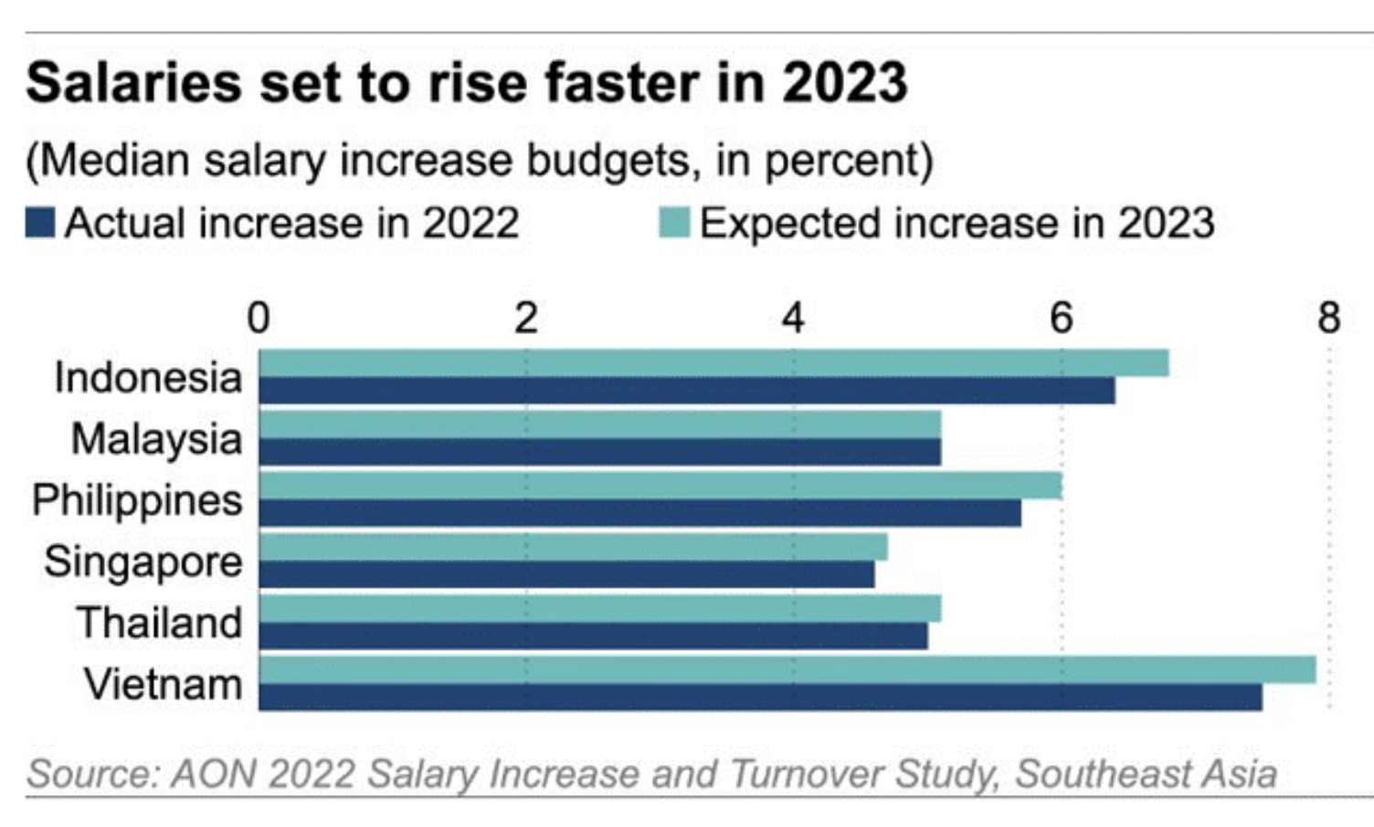 จากวิจัยของบริษัทที่ปรึกษาสหรัฐอเมริกา AON เกี่ยวกับค่าจ้างและอัตราการว่างงานในเอเชียตะวันออกเฉียงใต้ ภายในปี 2566 ระบุถึงการขึ้นอัตราค่าแรงเฉลี่ยสำหรับอุตสาหกรรมต่าง ๆ ในภูมิภาคเอเชียตะวันออกเฉียงใต้ โดยค่าแรงในอินโดนีเซียจะสูงขึ้นร้อยละ 6.8 มาเลเซียร้อยละ 5.1 ฟิลิปปินส์ร้อยละ 6 สิงคโปร์ร้อยละ 4.7 ไทยร้อยละ 5.1 และเวียดนามร้อยละ 7.9