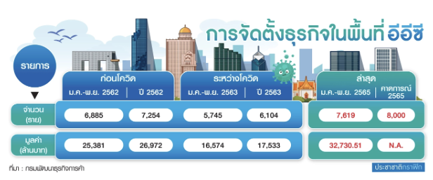 สะท้อนว่าภายหลังสถานการณ์การแพร่ระบาดของโควิด-19 ผ่อนคลายขึ้น ทำให้หลายประเทศผ่อนคลายมาตรการและกระตุ้นเศรษฐกิจ การจดทะเบียนจัดตั้งธุรกิจในพื้นที่ EEC ได้กลับมาเพิ่มขึ้นจากปีที่ผ่านมามาก