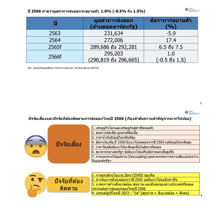 ม.หอการค้าไทย มั่นใจการส่งออกไทยปี 66 โตเพียง 1.0% ชี้ยังมีโอกาสเสี่ยงติดลบ 0.5% ซึ่งจะทำให้การส่งออกไทยต่ำสุดในรอบ 3 ปี