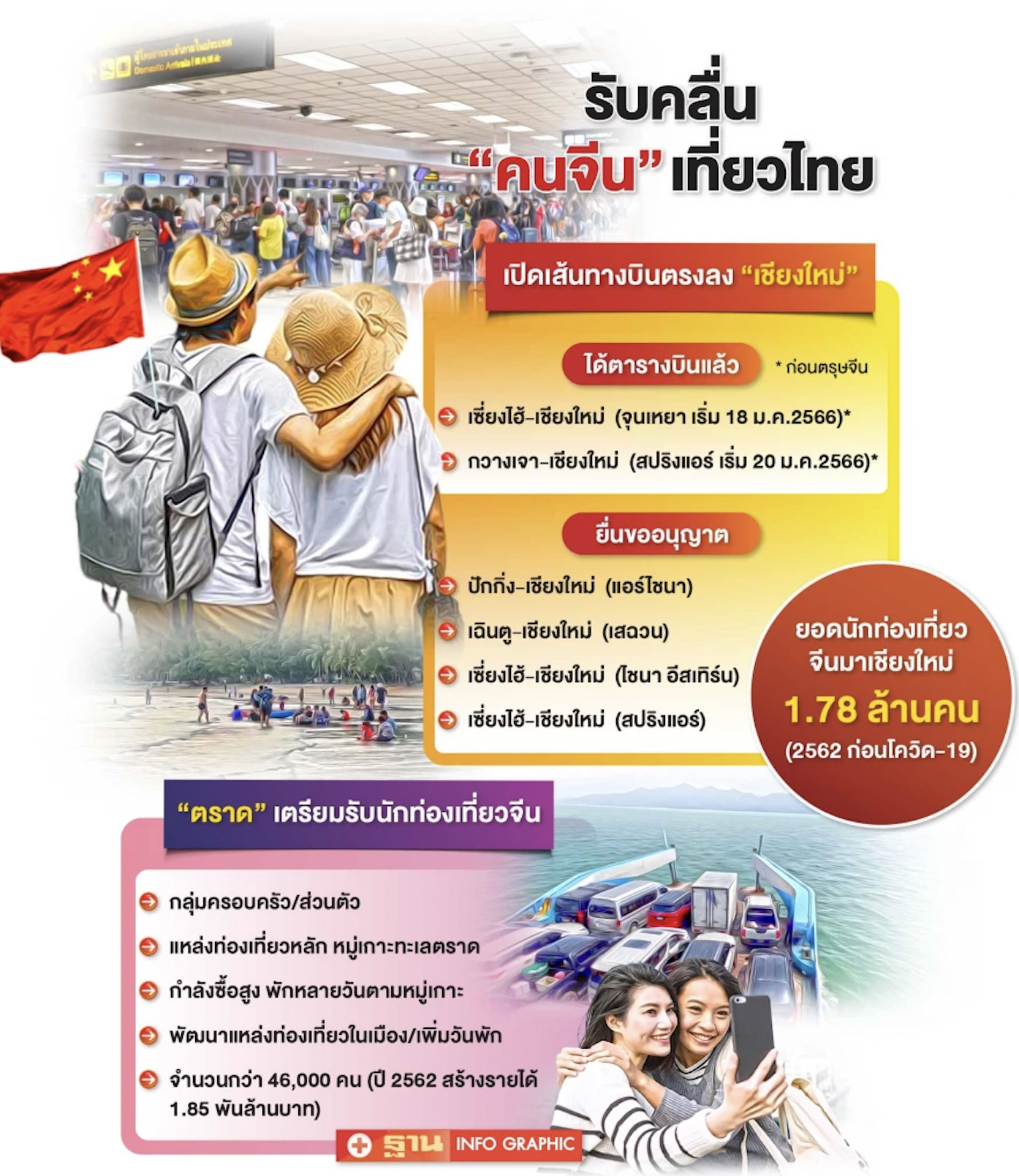 จีนเปิดประเทศปลุกกระแสท่องเที่ยวทั่วไทยคึกคัก สนามบินเชียงใหม่เตรียมรับเพิ่มเที่ยวบินตามตารางจากจีน "ตราด" พร้อมรับกลุ่มครอบครัวจีนที่จ่ายหนักและนิยมเที่ยวหมู่เกาะ