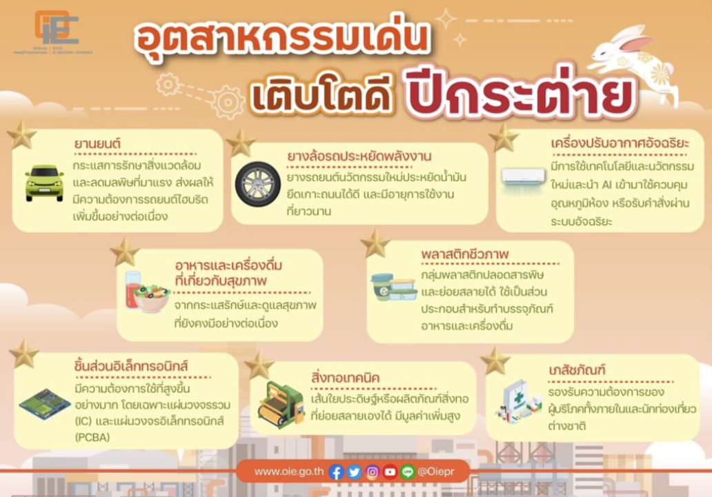 สศอ. เผย 8 อุตสาหกรรมเด่นที่จะขยายตัวในปี 2566 "EV อิเล็กทรอนิกส์ พลาสติกชีวภาพ อาหารเพื่อสุขภาพ" รับประโยชน์จากการขยายตัวของตลาดโลก สถานการณ์ภายในประเทศ มาตรการกระตุ้นเศรษฐกิจ และการท่องเที่ยวฟื้นตัวหลังเปิดประเทศ หนุนเศรษฐกิจและการบริโภค