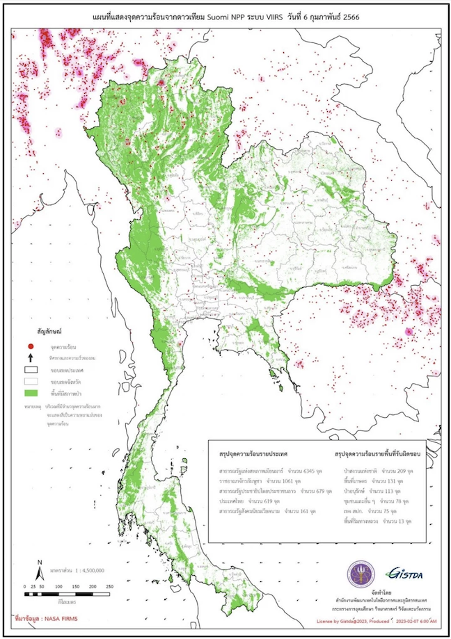 วันที่ 7 ก.พ. 66 สำนักงานพัฒนาเทคโนโลยีอวกาศและภูมิสารสนเทศ (องค์การมหาชน) หรือ GISTDA เผยข้อมูลจากดาวเทียมซูโอมิ เอ็นพีพี (Suomi NPP) ของระบบเวียร์ (VIIRS) ไทยพบจุดความร้อนวานนี้ (6 ก.พ. 66) จำนวน 619 จุด