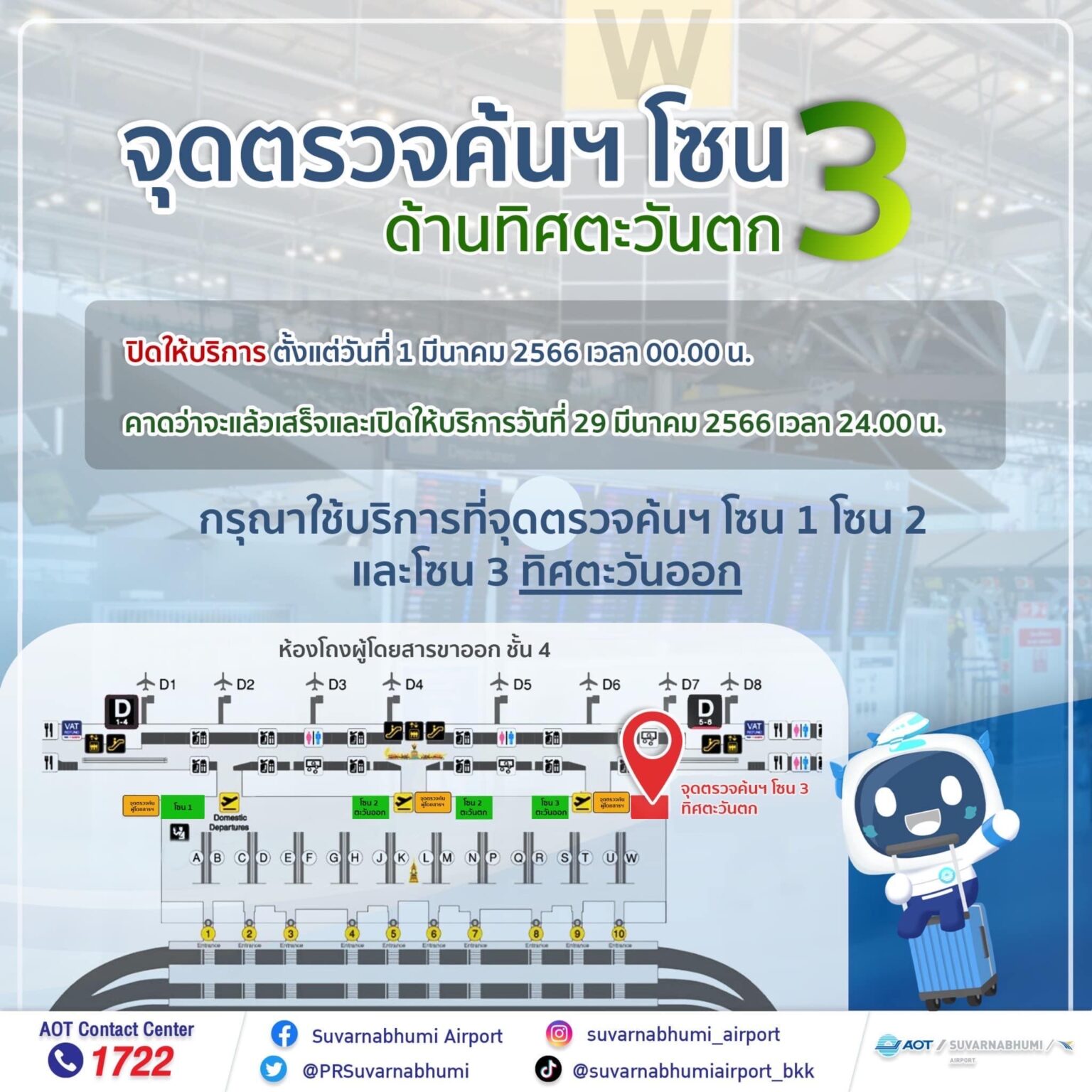 ท่าอากาศยานสุวรรณภูมิขออภัยในความไม่สะดวกในช่วงเวลาที่ต้องปิดพื้นที่จุดตรวจค้นผู้โดยสารขาออกบางส่วนชั่วคราว เพื่อดำเนินการดังกล่าว และขอความร่วมมือผู้โดยสารที่จะเดินทางเที่ยวบินขาออกระหว่างประเทศควรเผื่อเวลาก่อนการเดินทางประมาณ 3 ชั่วโมง