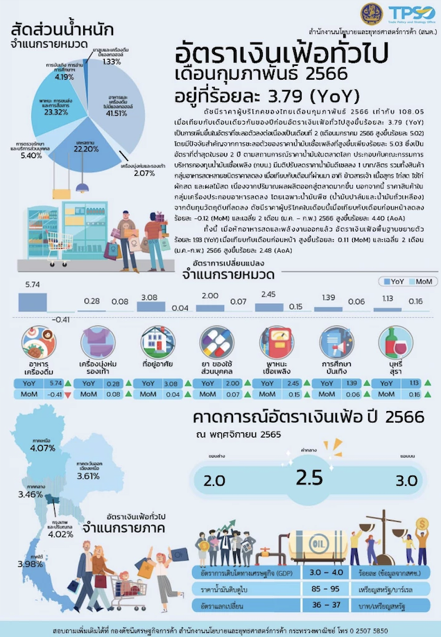 ดัชนีราคาผู้บริโภคของไทย หรือ 'เงินเฟ้อ' เดือนก.พ. 2566 เท่ากับ 108.05 เมื่อเทียบกับเดือนเดียวกันของปีก่อน ซึ่งเท่ากับ 104.10 ส่งผลให้อัตราเงินเฟ้อทั่วไป สูงขึ้น 3.79 % ชะลอตัวต่อเนื่องเป็นเดือนที่ 2 และอยู่ระดับต่ำสุดในรอบ 13 เดือน ส่งผลให้เงินเฟ้อทั่วไป ชะลอตัวลงเข้าใกล้กรอบเป้าหมายที่กำหนดไว้ที่ 2-3% ในปีนี้