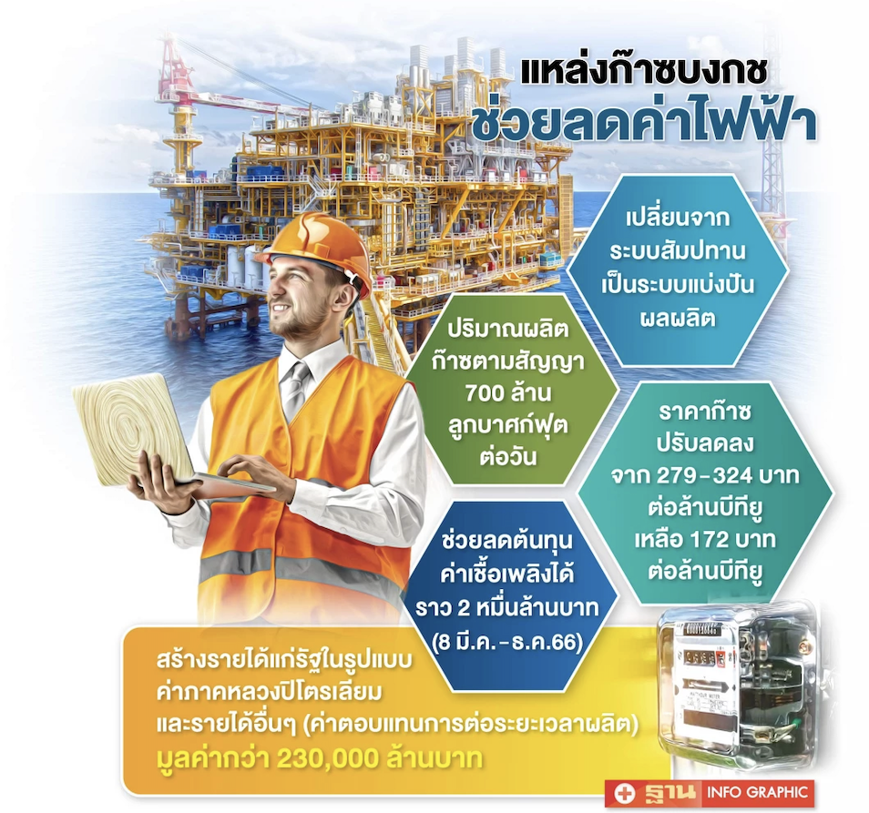 อย่างไรก็ตาม มีข่าวดีที่พอจะช่วยให้ประชาชนอาจได้ใช้ไฟฟ้าในราคาที่ถูกลง ซึ่งเป็นผลมาจากการเปลี่ยนผ่านการดำเนินงานสำรวจและผลิตก๊าซธรรมชาติแหล่งบงกช แปลง G2/61 จากระบบสัมปทานมาเป็นระบบสัญญาแบ่งปันผลผลิตตั้งแต่วันที่ 8 มีนาคม 2566 ที่ผ่านมา และมีผลทำให้ก๊าซธรรมชาติที่ผลิตได้จากแปลง G2/61 มีราคาปรับลดลงประมาณ 107-152 บาทต่อล้านบีทียู (ปรับจาก 279-324 บาทต่อล้านบีทียู ลดลงเหลือ 172 บาทต่อล้านบีทียู)