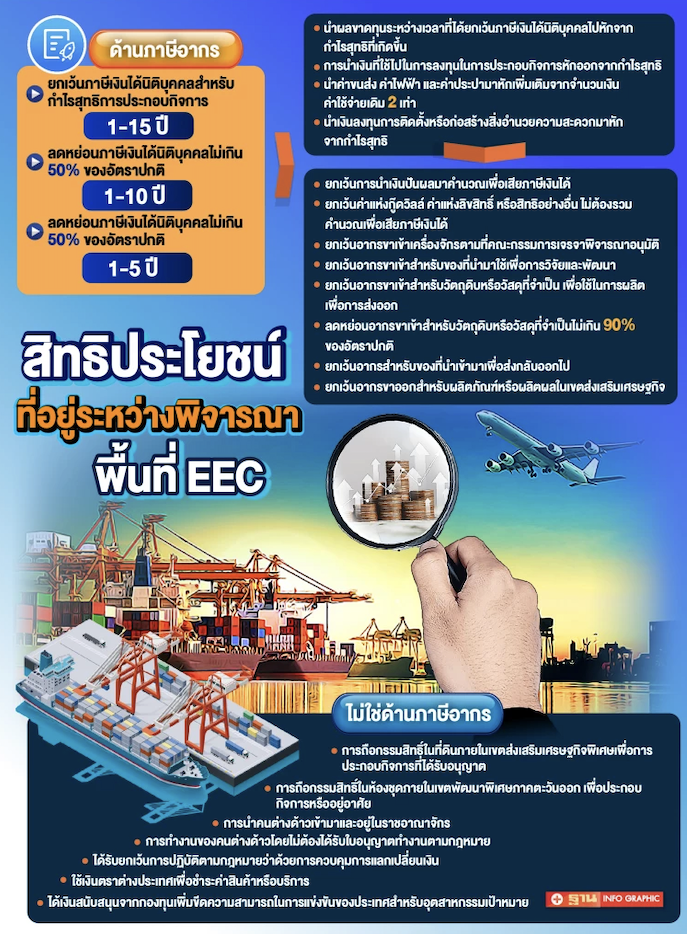 สกพอ. เร่งปรับสิทธิประโยชน์ส่งเสริมการลงทุนในพื้นที่ EEC ยกเว้นภาษีเงินได้นิติบุคคลสูงสุด 15 ปี พร้อมสิทธิประโยชน์ในการถือครองที่ดิน ห้องชุด การทำงานของคนต่างชาติ ดึงดูดการลงทุนในอุตสาหกรรมที่ใช้เทคโนโลยีขั้นสูง ทันสมัย สร้างนวัตกรรม เป็นมิตรต่อสิ่งแวดล้อม