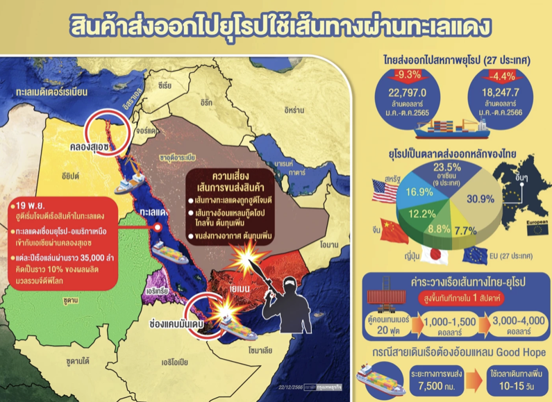 สำหรับการส่งออกสินค้าไทยไปยุโรปจะใช้เส้นทางผ่านทะเลแดง โดยยุโรปถือเป็นตลาดส่งออกหลักของไทยที่ในช่วงเดือน ม.ค.-ต.ค.2566 การส่งออกไปสหภาพยุโรป (27 ประเทศ) มีมูลค่า 18,247 ล้านดอลลาร์ เทียบช่วงเดียวกันกับปีที่แล้วลดลง 4.4% ขณะที่มูลค่าการส่งออกคิดเป็นสัดส่วน 7.7% เมื่อเทียบการส่งออกรวมของไทย