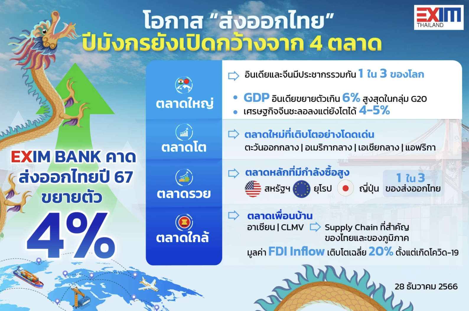 EXIM BANK ชี้โอกาส "ตลาดส่งออก" ปีมังกรยังเปิดกว้างจากทิศทางการค้าโลกที่ฟื้นตัว หนุนการส่งออกไทยปี 2567 ขยายตัว 4% แนะผู้ส่งออกเตรียมกลยุทธ์เชิงรุกเพื่อเจาะและกระจายตลาดส่งออกอย่างสมดุล ควบคู่ไปกับกลยุทธ์เชิงรับในการป้องกันความเสี่ยงต่างๆ