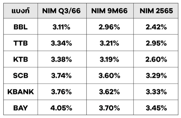 จากข้อมูลล่าสุด ณ ไตรมาส 3/2566 ของ 6 ธนาคารขนาดใหญ่ในไทย NIM ของแต่ละธนาคารเป็นดังนี้