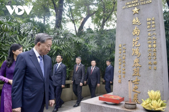 หลังจากเดินทางถึงมณฑลกวางตุ้ง เลขาธิการใหญ่พรรค ประธานประเทศ โตเลิม พร้อมภริยาและคณะฯได้ไปวางพวงมาลาและจุดธูปเพื่อรำลึกถึงทหารพลีชีพเพื่อชาติ ฝ่ามห่งท้าย และบรรดานักปฏิวัติอาวุโส ณ สุสานฮว่างฮัวกาง ด้านหน้าหลุมศพของทหารพลีชีพเพื่อชาติ ฝ่ามห่งท้าย มีศิลาขนาดใหญ่เขียนคำว่า “สุสานทหารพลีชีพเพื่อชาติ ฝ่ามห่งท้าย” เป็นภาษาเวียดนามและภาษาจีน ซึ่งเป็นสถานที่ที่มีความหมายสำคัญที่คนเวียดนามทุกคนที่มาเยือนกวางโจวต่างมาที่นี่เพื่อเยี่ยมเยือนและจุดธูปเทียน
