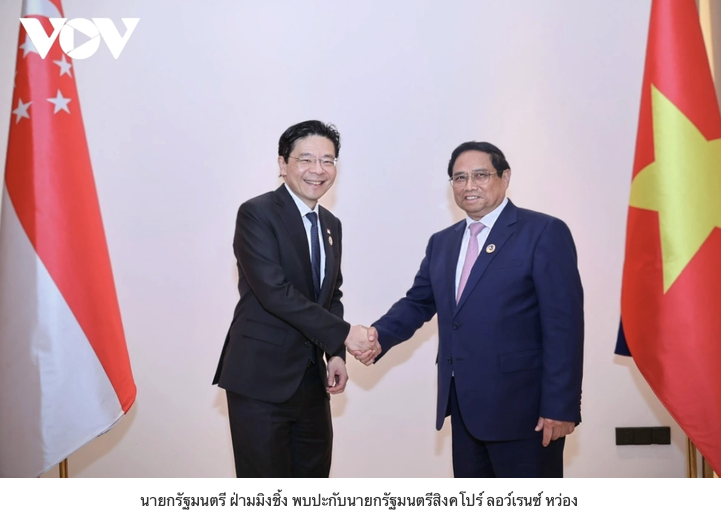 ส่วนในการเจรจากับนายกรัฐมนตรีสิงคโปร์ ลอว์เรนซ์ หว่อง ผู้นำทั้งสองท่านได้ยืนยันความตั้งใจยกระดับความสัมพันธ์ทวิภาคีขึ้นสู่ขั้นสูงใหม่ เห็นพ้องกันว่า ความร่วมมือด้านเศรษฐกิจยังคงเป็นเสาหลักที่สำคัญ ประสานงานในการปฏิบัติกรอบข้อตกลงเกี่ยวกับการเชื่อมโยงเศรษฐกิจและความสัมพันธ์หุ้นส่วนเศรษฐกิจแห่งสีเขียว เศรษฐกิจดิจิทัลเวียดนาม-สิงคโปร์ พร้อมทั้งย้ำว่า ต้องผลักดันความร่วมมือในด้านที่สำคัญต่างๆ เช่น กลาโหม ความมั่นคง การศึกษาและฝึกอบรม วัฒนธรรมและการพบปะสังสรรค์ระดับประชาชน ส่วนนายกรัฐมนตรี ฝ่ามมิงชิ้งยืนยันว่า จะอำนวยความสะดวกให้แก่สถานประกอบการสิงคโปร์ขยายการลงทุนในเวียดนาม