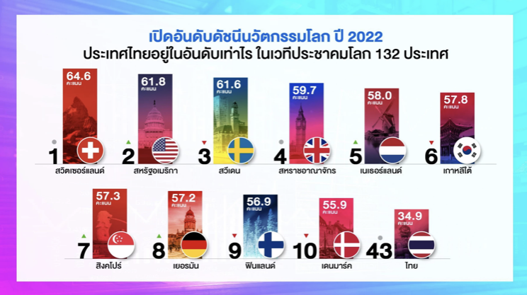 สำนักงานนวัตกรรมแห่งชาติ (องค์กรมหาชน) หรือ NIA เผยผลการจัดอันดับดัชนีนวัตกรรมโลก ประจำปี 2565 (Global Innovation Index 2022; GII 2022) ภายใต้ธีมอนาคตของการเติบโตด้วยการขับเคลื่อนบนฐานนวัตกรรมคืออะไร (What is the future of innovation-driven growth?)